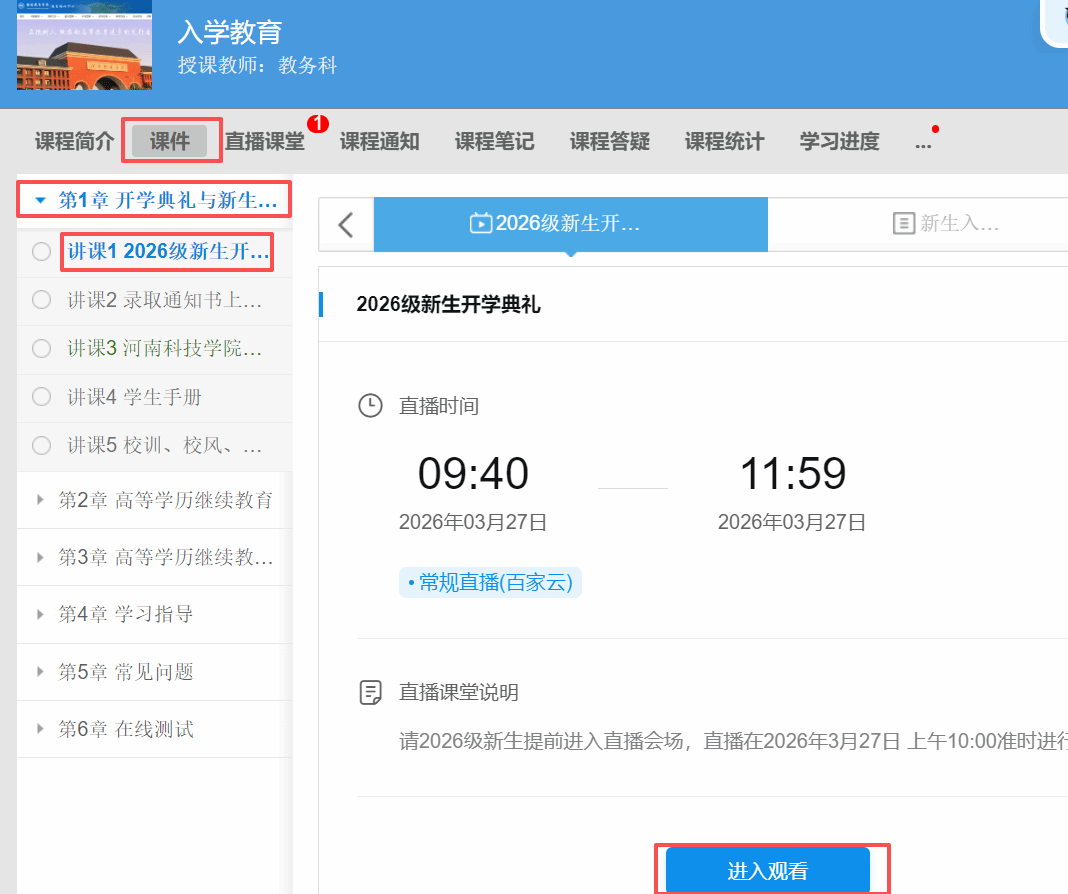 新生以学号为账号,身份证后六位为初始密码,登录学习平台(电脑端https://hnkj.cep.webtrn.cn/np/#/login或移动端“睿学app),点击“在学课程”,选择《入学教育》,进入课件“第1章讲课1:2026级新生开学典礼”,点击“进入观看”。